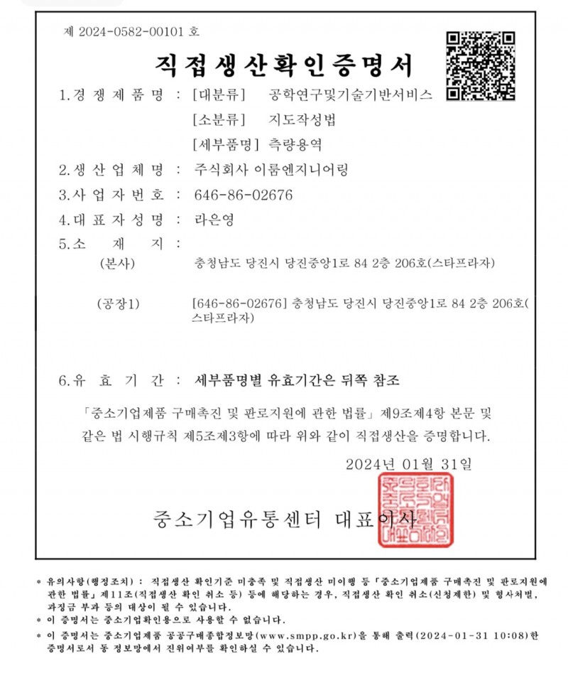 직접생산확인증명서 페이지 정보 등록일 : 24-02-07 조회 : 352 본문 직접생산확인증명서 목록 이전글 직접생산확인증명서(지질학) 24.02.07 다음글 엔지니어링사업자 신고증 24.02.07